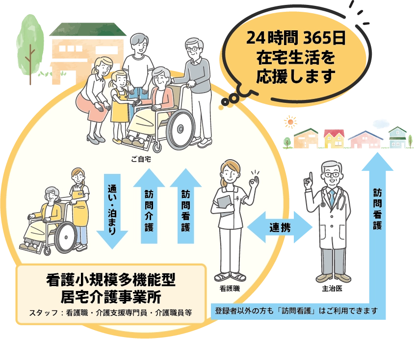 - 「看護」「通い」「訪問介護」「泊まり」のサービスが一体的に提供されます